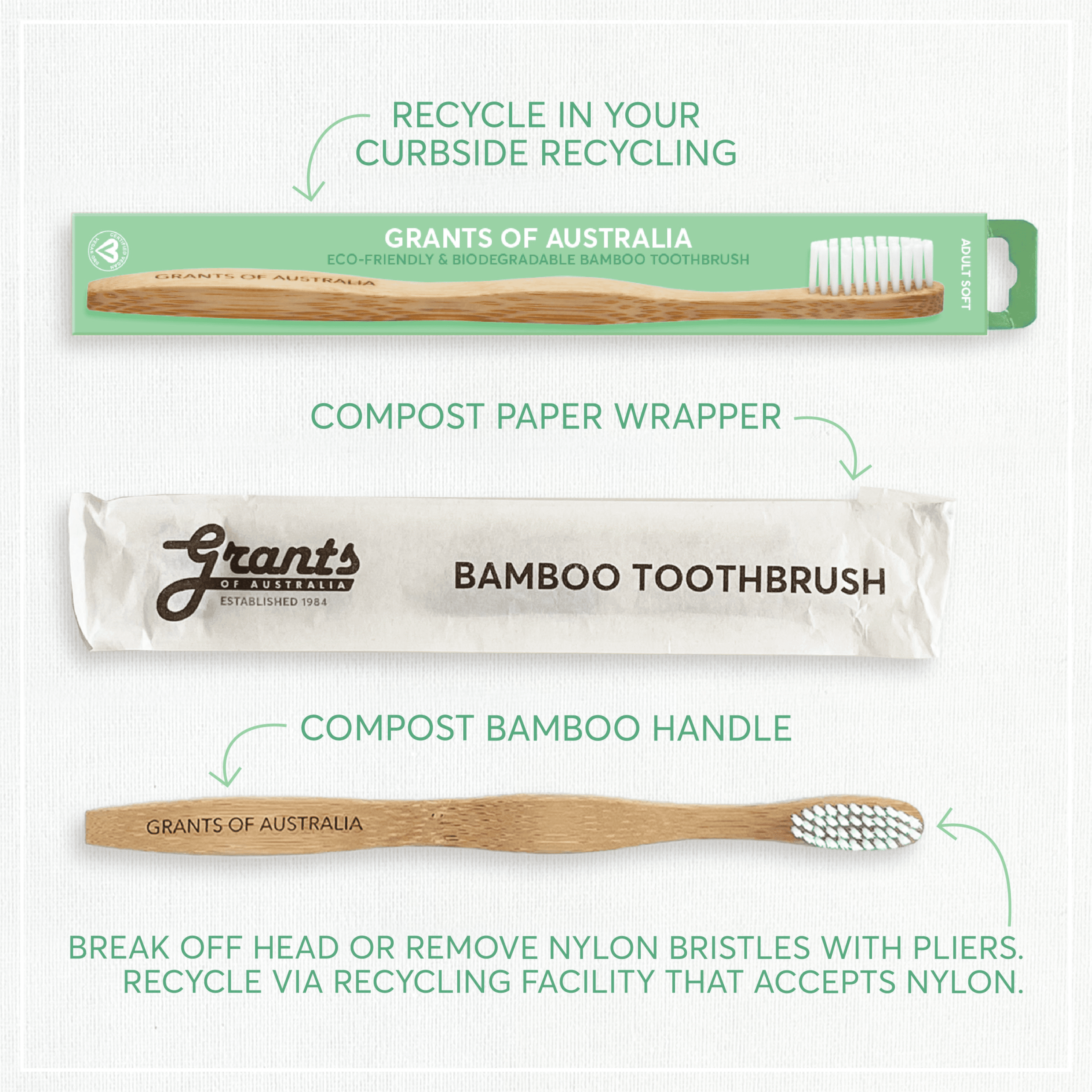 Grants biodegradable bamboo toothbrush is an eco-friendly way to brush your teeth. Our handles are made from 100% biodegradable and environmentally sustainable bamboo. The bristles are made from nylon which aren’t compostable but can be recycled. Break off the bristle head or remove the bristles with pliers and recycle as per your local recycling facility guidelines. The bare bamboo handle can then be composted and will safely return to the soil. Each toothbrush is individually sealed in a paper wrapper that can be composted and boxes can be recycled.