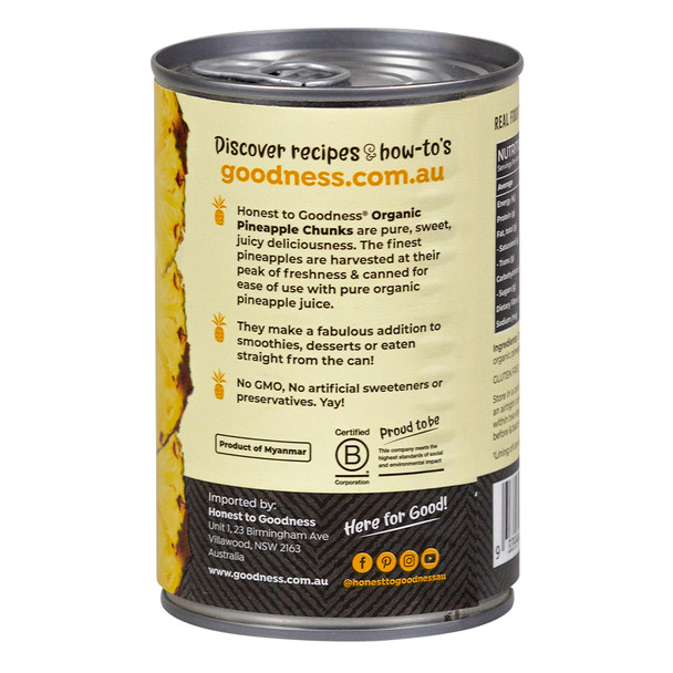 Honest to Goodness Organic Pineapple Chunks are pure deliciousness! Naturally sweet with no added sugar and no artificial preservatives or flavours.