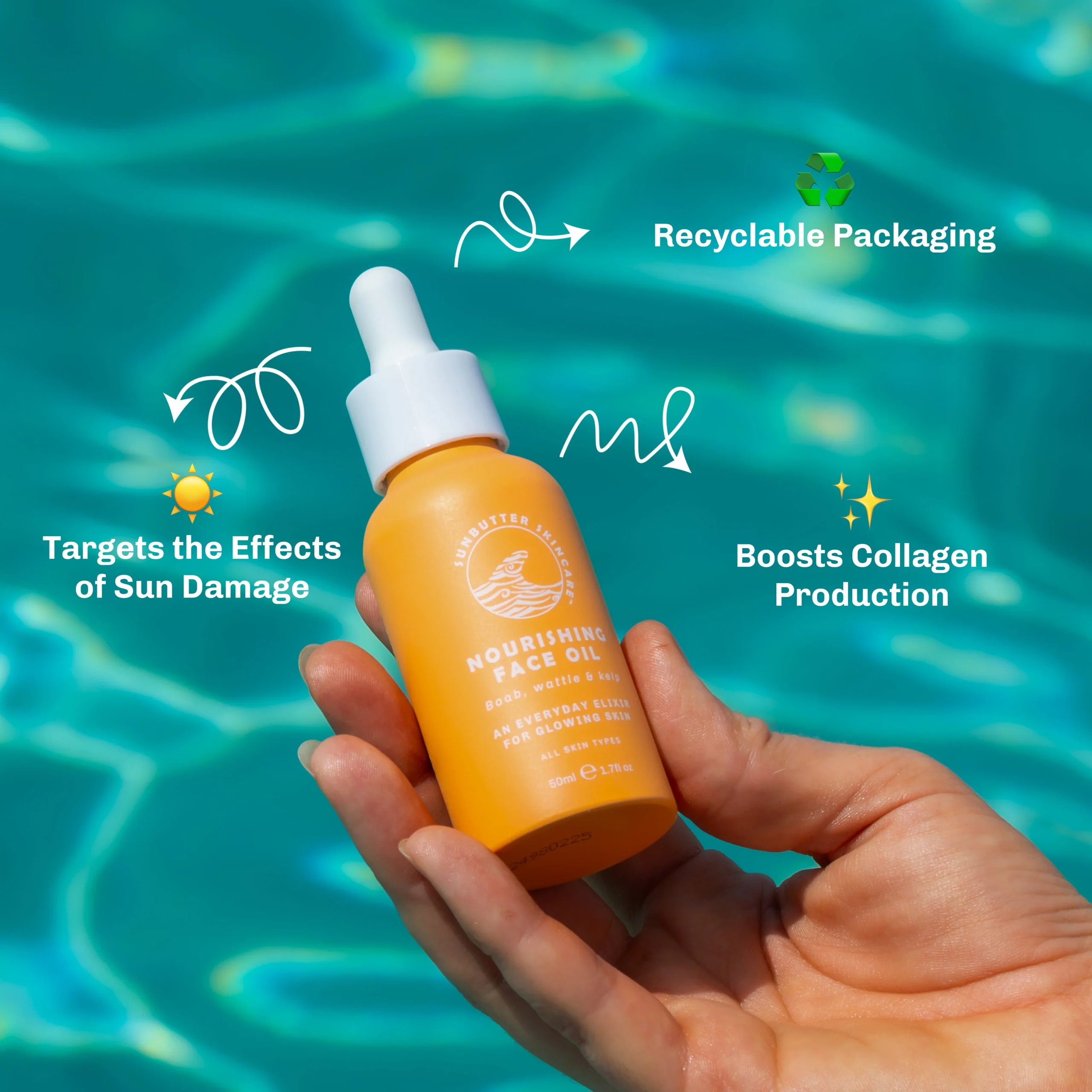 A nourishing blend of 7 botanical oils that delivers hydration and antioxidant protection, our Boab, Wattle & Kelp Face Oil works to soften, rejuvenate, and protect sun-exposed skin. Packed with vitamins to support collagen production, it absorbs quickly to leave skin feeling soft, plump, and radiant. Suitable for all skin types, this non-greasy oil blend is perfect for daily use to boost skin health and lock in lasting moisture.